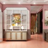 Bên cạnh đó, sản phẩm Pháp phục được trưng bày gọn gàng trên giá đỡ bằng gỗ kiểu dáng đơn giản nhưng tinh tế. Kệ có nhiều ngăn khác nhau, kích thước đa dạng giúp khách hàng dễ dàng quan sát và lựa chọn. Kệ trưng bày trà thảo dược được làm từ gỗ, bày biện các lọ trà thảo mộc hình dáng khác nhau tạo điểm nhấn thu hút ánh nhìn. Mỗi sản phẩm đều có bảng thông tin chi tiết để người mua tìm hiểu về nguồn gốc và công dụng.