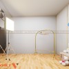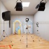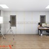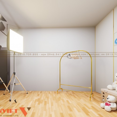 Tripod, camera và ring light được bố trí cố định. Điều này giúp tiết kiệm thời gian setup mỗi buổi livestream. Sàn gỗ sáng màu tăng độ phản xạ ánh sáng. Chủ đầu tư có thể dễ dàng thay đổi concept mà không cần cải tạo lớn.