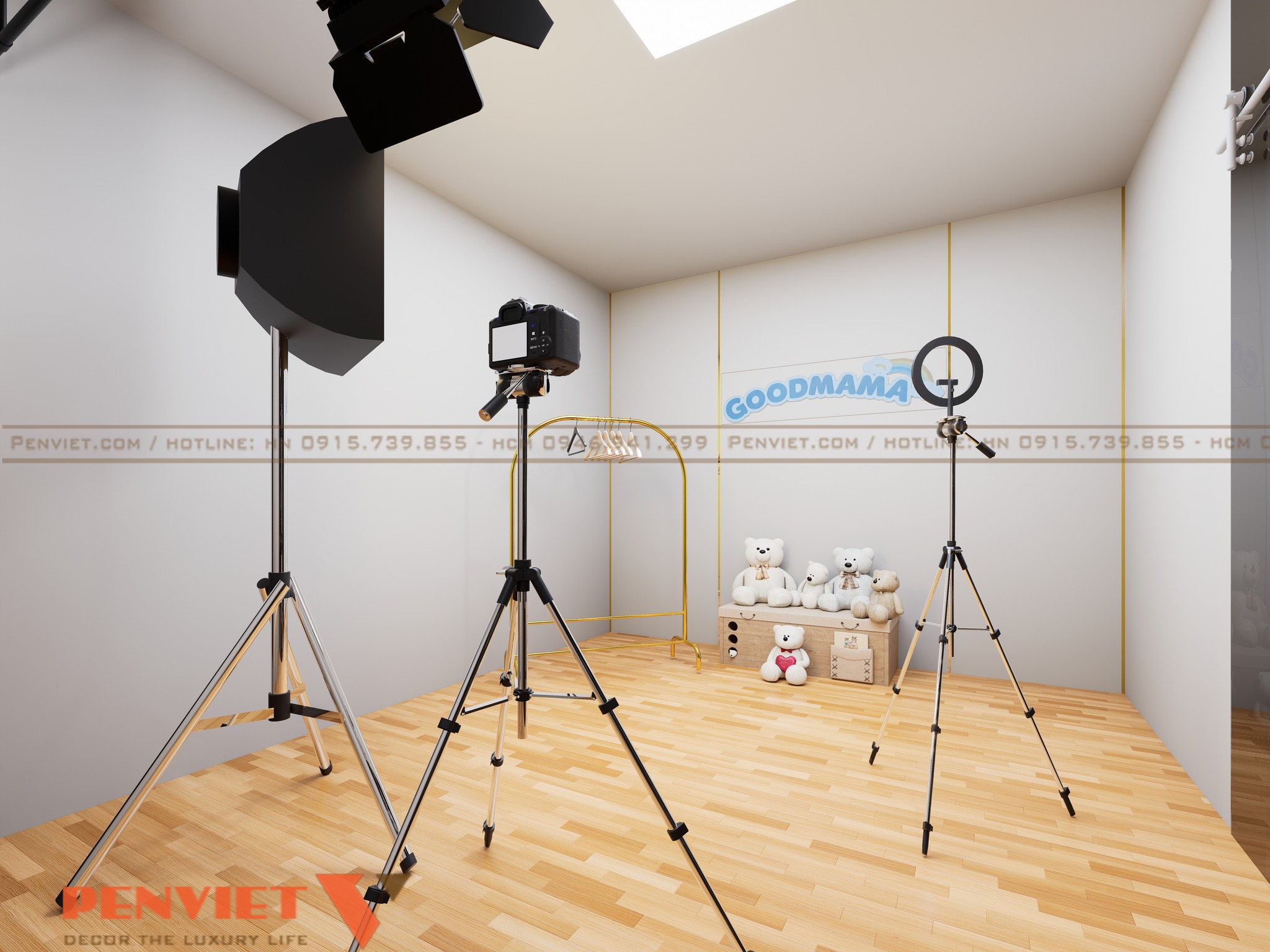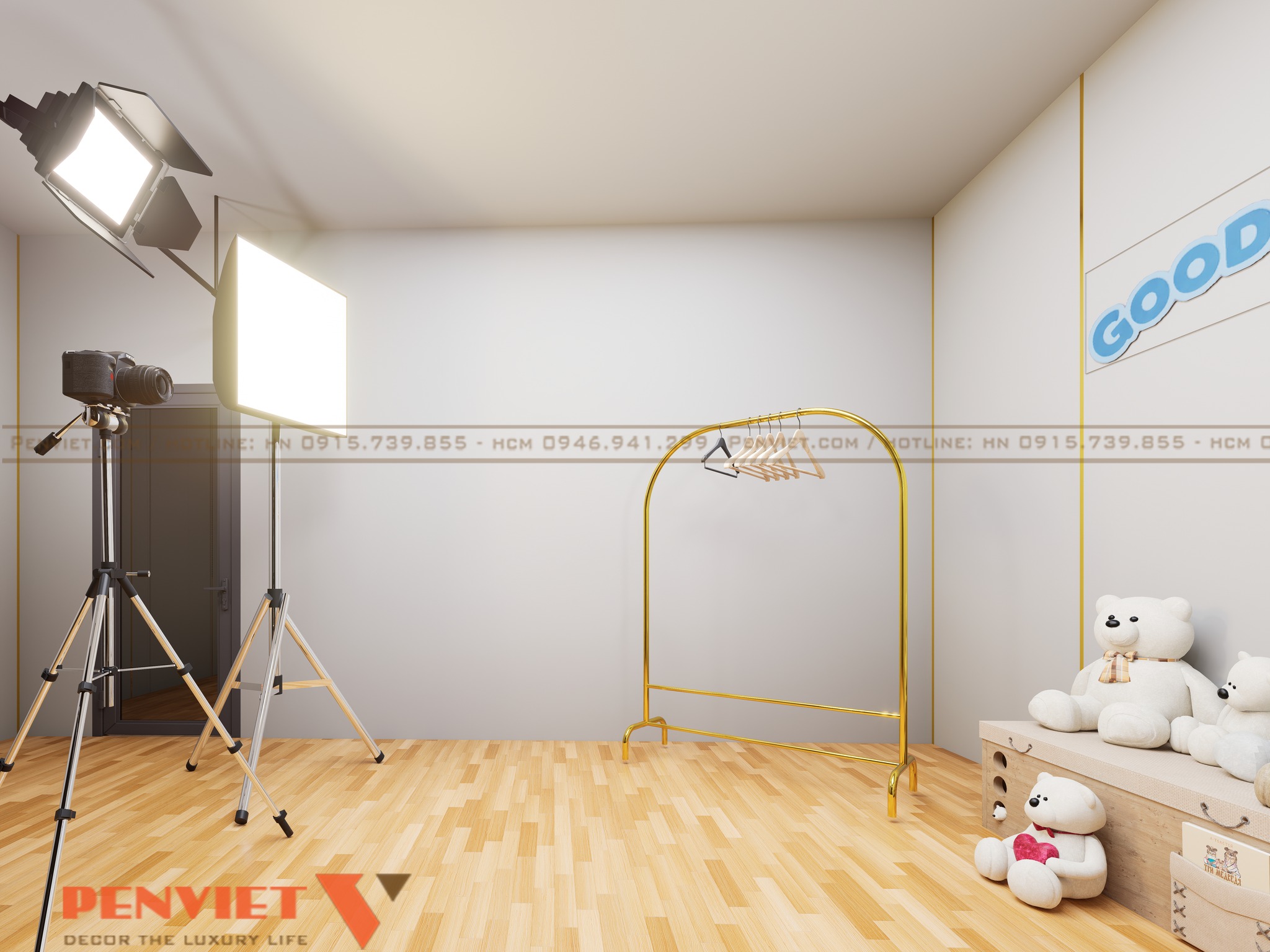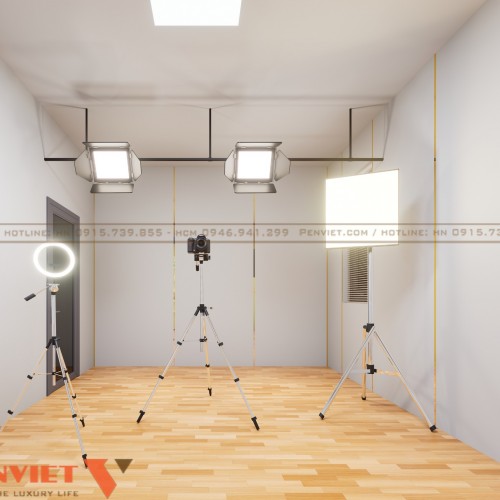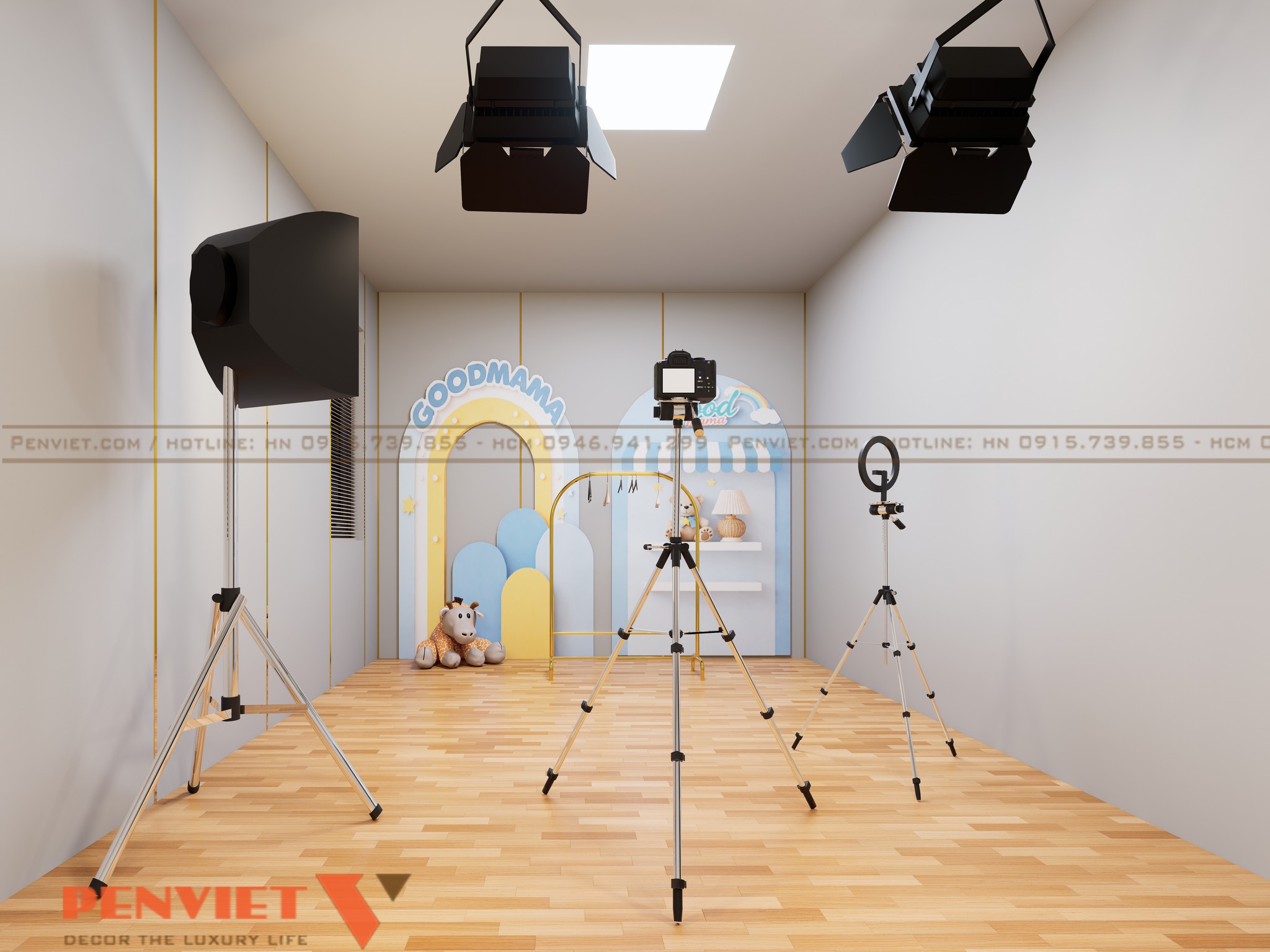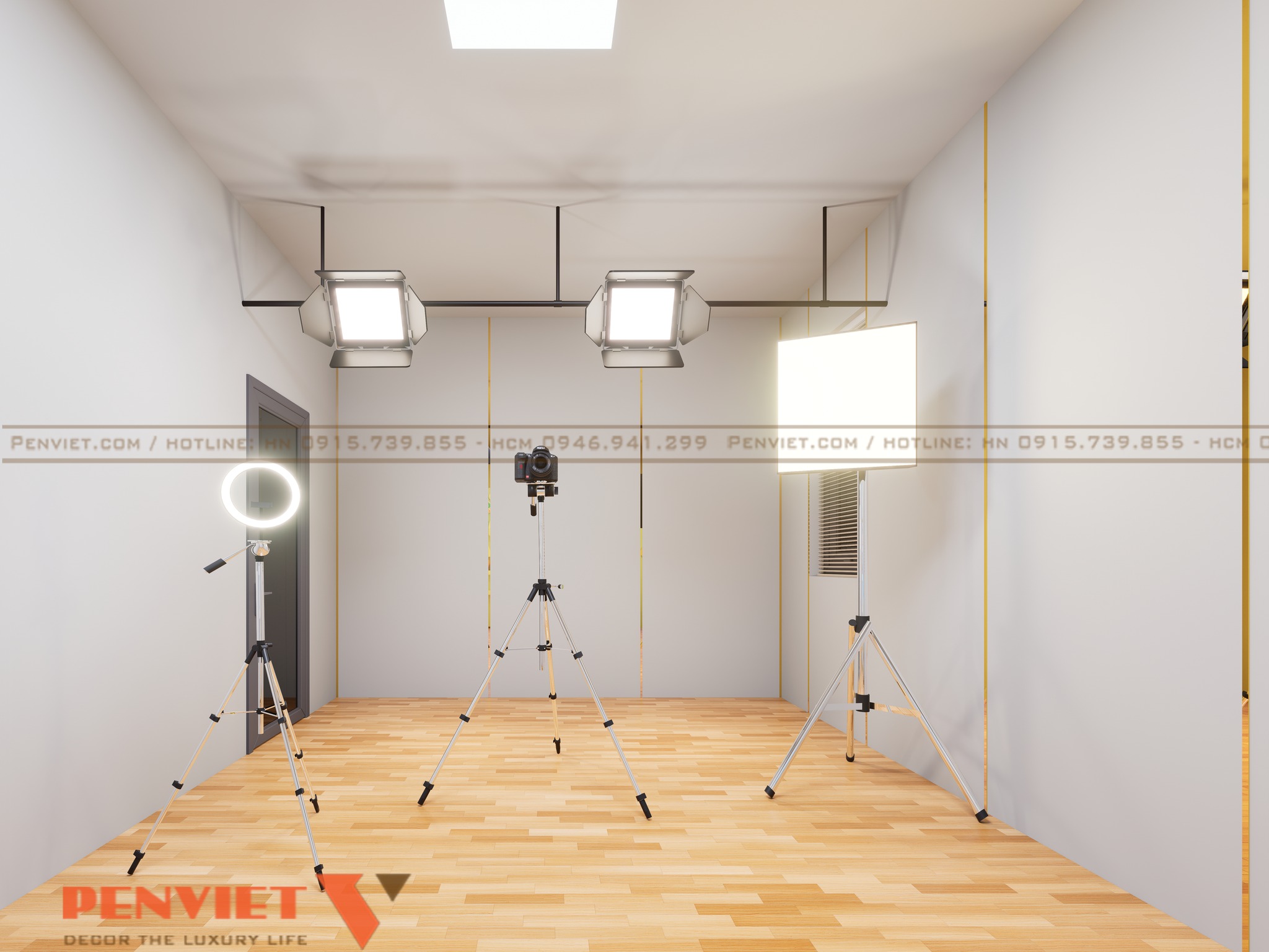 Không gian quay được thiết kế theo tiêu chuẩn studio mini. Hệ đèn softbox và đèn trần bố trí đồng đều, giảm bóng đổ. Background sáng màu giúp hình ảnh lên màu trung thực, phù hợp nhiều concept. Các chi tiết decor nhẹ nhàng tạo chiều sâu khung hình.