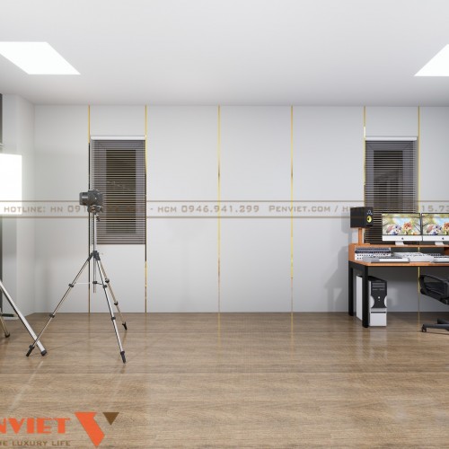 Vách kính trong suốt là điểm nhấn quan trọng. Giải pháp này tạo sự kết nối nhưng vẫn đảm bảo cách âm tương đối. Chủ đầu tư có thể quan sát toàn bộ hoạt động quay mà không ảnh hưởng set up. Đây là lựa chọn tối ưu cho phòng livestream quy mô vừa.