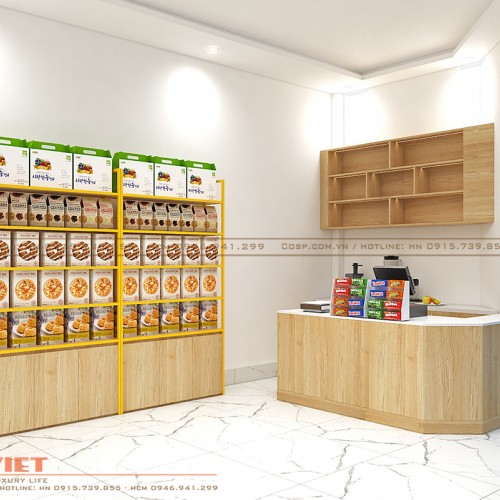 Vừa bước vào cửa hàng, bạn sẽ bắt gặp quầy thu ngân được bố trí bên góc phải nhằm tạo thuận tiện cho khách hàng khi thanh toán. Quầy có thiết kế vát cạnh tạo sự an toàn cho khách khi thực hiện giao dịch. Phía sau quầy là hệ thống giá kệ treo để tăng thêm phần diện tích trưng bày sản phẩm.