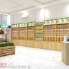 Tiếp đến là dãy giá kệ đặt sát tường bằng khung sắt sơn nhũ vàng kết hợp gỗ MDF rất bền bỉ. Nơi đây được sử dụng để trưng bày các dòng bánh kẹo khác nhau đáp ứng mọi nhu cầu của khách hàng.