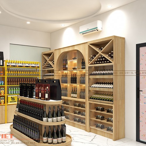 Ngoài ra, ở giữa không gian còn bày trí quầy đảo trưng bày rượu với chiều cao hợp lý không che khuất tầm nhìn của khách hàng.