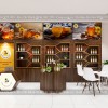 Còn dãy kệ sát tường ở bên trái cửa hàng là loại được làm từ khung gỗ MDF phủ melamine, có hậu làm từ MDF phủ melamine 6mm. Kệ được chia thành nhiều đợt nhỏ và có trang trí thêm bộ chữ “MẬT ONG BÁC LẬP” bằng mica dẹt ở góc trên cùng. Ngoài ra, trên trán tủ còn được trang trí thêm bằng tranh áp phích dán backlit.