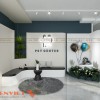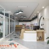 Ngay khi bước vào bên trong, khách hàng sẽ gặp quầy thu ngân nằm phía bên trái. Thiết kế quầy theo đường cong mềm mại, kết hợp giữa gỗ và vật liệu sáng màu giúp không gian tiếp tân trở nên thân thiện nhưng vẫn hiện đại. Phía sau quầy là mảng tường bo tròn cách điệu, tích hợp kệ trang trí hình tròn, vừa giúp tạo chiều sâu thị giác vừa là điểm nhấn nghệ thuật.