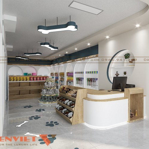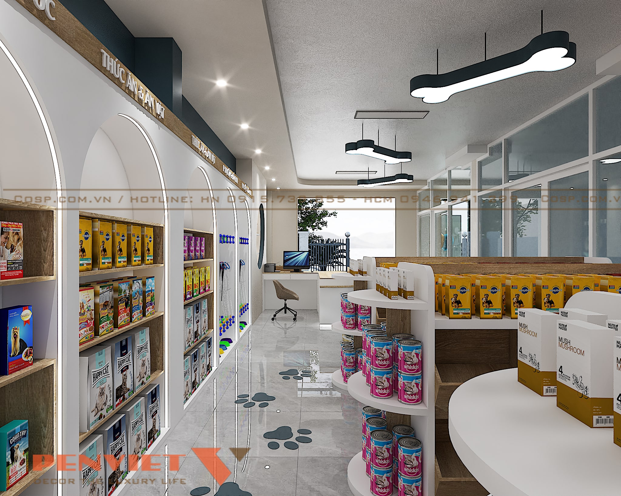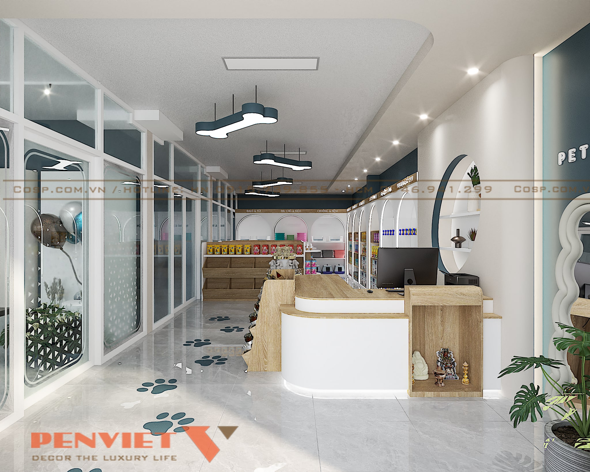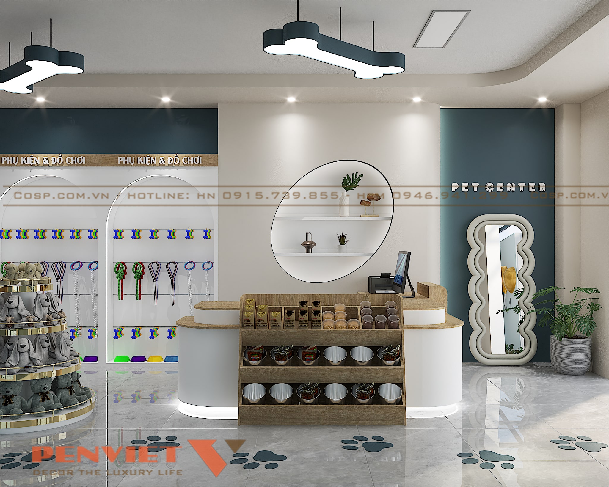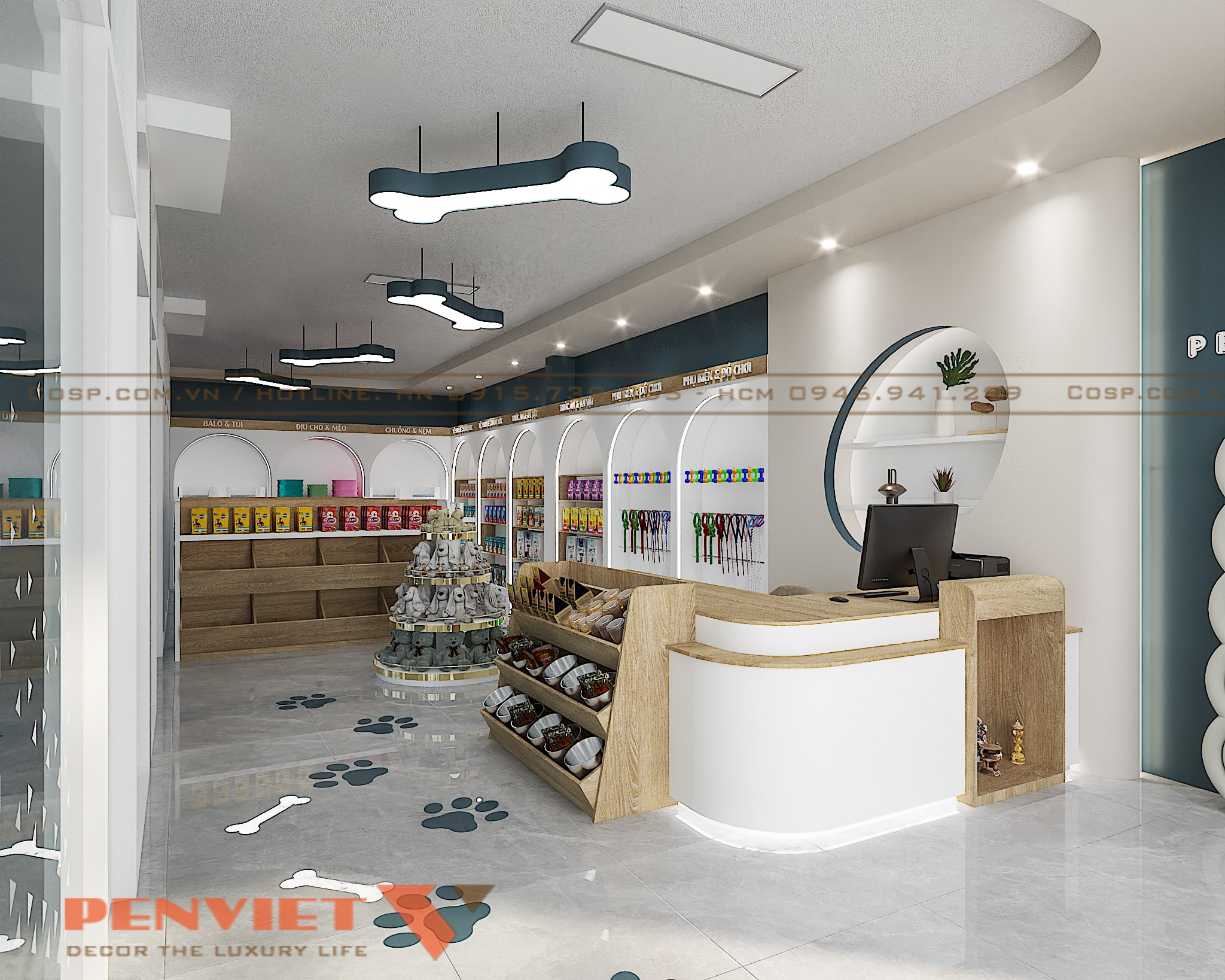Thiết kế shop Pet Center tập trung vào việc tổ chức không gian hiệu quả, khoa học và gần gũi. Mỗi chi tiết từ bảng hiệu, mặt bằng đến cách sắp xếp kệ trưng bày đều thể hiện tư duy thiết kế lấy trải nghiệm khách hàng làm trọng tâm. Nếu bạn muốn tìm hiểu ý tưởng thiết kế nội thất, hãy liên hệ PenViet để được hỗ trợ.