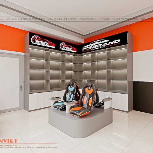 Shop kinh doanh sản phẩm phụ kiện xe ô tô nên thiết kế theo phong cách hiện đại phù hợp với sản phẩm kinh doanh. 3 màu sắc được phối hợp tạo nên tổng thể shop bao gồm trắng, cam và xám