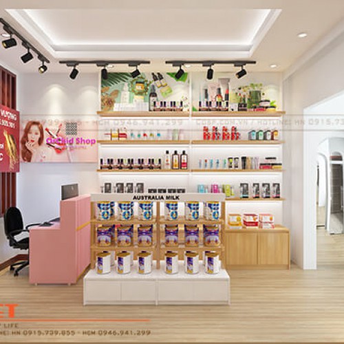 Nhằm đáp ứng nguyện vọng của khách hàng cũng như tối ưu được diện tích của cửa tiệm, chúng tôi định hình phong cách hiện đại cho mẫu thiết kế shop thực phẩm chức năng Sâm nấm Hàn Quốc. Các mẫu quầy kệ kiểu dáng tinh giản được lựa chọn nhằm tạo sự gọn gàng, thông thoáng cho không gian.