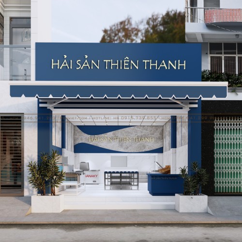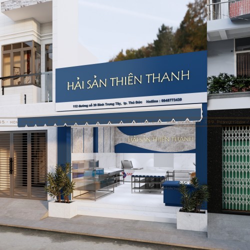 Cửa hàng kinh doanh hải sản Thiên Thanh có mặt tiền được thiết kế đơn giản nhưng hiện đại. Với màu xanh dương chủ đạo cho hệ biển bảng quảng cáo cùng bộ chữ mica màu vàng nổi bật thu hút ánh nhìn. Đây là cách để cửa hàng tăng nhận diện thương hiệu của cửa hàng trước phố xá kinh doanh tấp nập.
