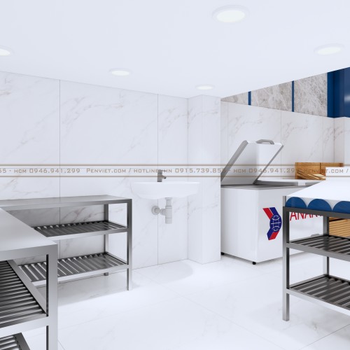 Khu vực chế biến nằm phía sau các quầy trưng bày, được ngăn cách bằng các quầy inox và tường kính trong suốt. Thiết kế này vừa đảm bảo sự riêng tư, vừa cho phép khách hàng theo dõi quá trình chế biến, tạo sự tin tưởng và cảm giác hài lòng.