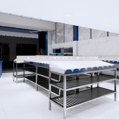 Không gian nội thất cửa hàng kinh doanh hải sản Thiên Thanh đóng vai trò quan trọng trong việc tạo ấn tượng đầu tiên cho khách hàng. Thấu hiểu điều đó, PenViet đã gợi ý phương án thiết kế tiệm hải sản Thiên Thanh với phong cách hiện đại đáp ứng đủ công năng sử dụng. Bài viết này sẽ phân tích chi tiết về cách bố trí không gian, nội thất và cách sử dụng vật liệu, màu sắc cho cửa hàng.