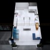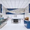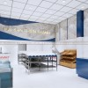 Bàn chế biến được thiết kế gọn gàng, sử dụng các vật liệu dễ lau chùi như inox, đảm bảo đáp ứng các tiêu chuẩn vệ sinh nghiêm ngặt. Tường nhà được ốp đá hoa cương với đường vân tự nhiên mang vẻ đẹp sang trọng. Mảng tường nhấn nhá dải màu xanh biển đậm, giúp cửa hàng trở nên nổi bật hơn.