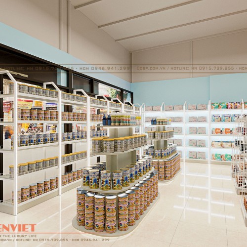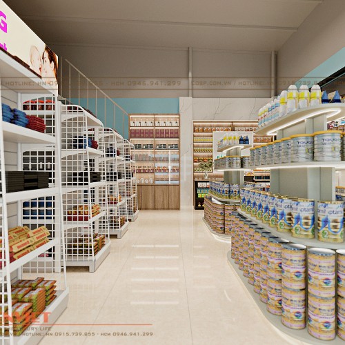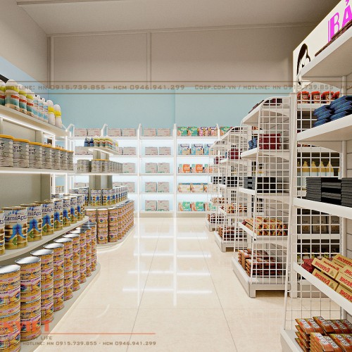Hầu hết Kệ bày sữa bột, sữa hộp và bỉm đều được thiết kế từ khung sắt hộp kết hợp các đợt gỗ melamine, có led hắt sáng.