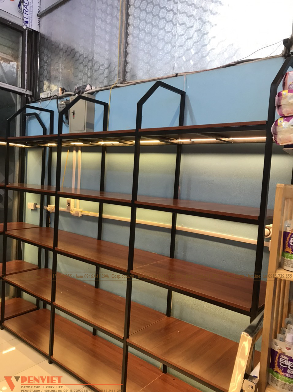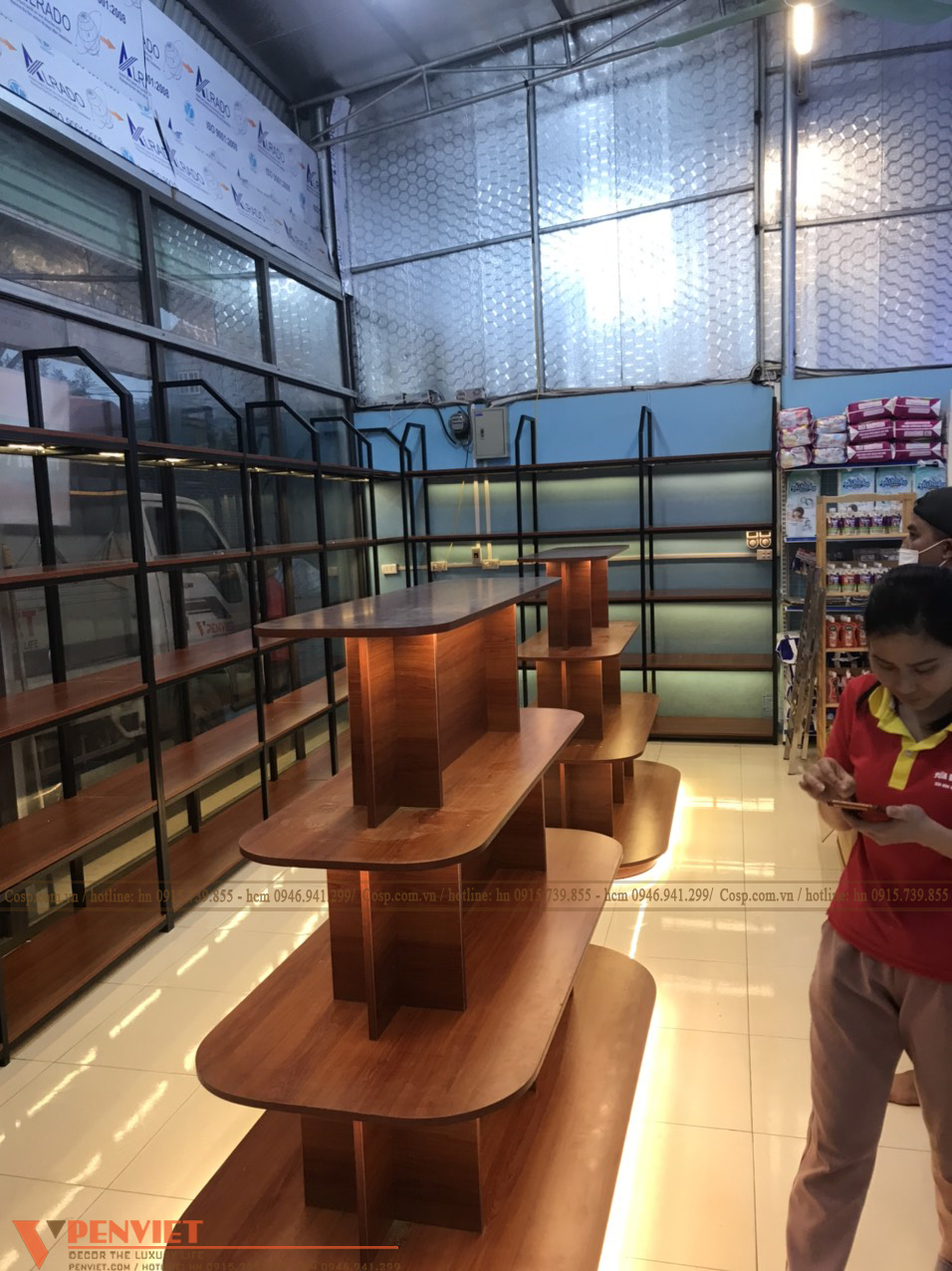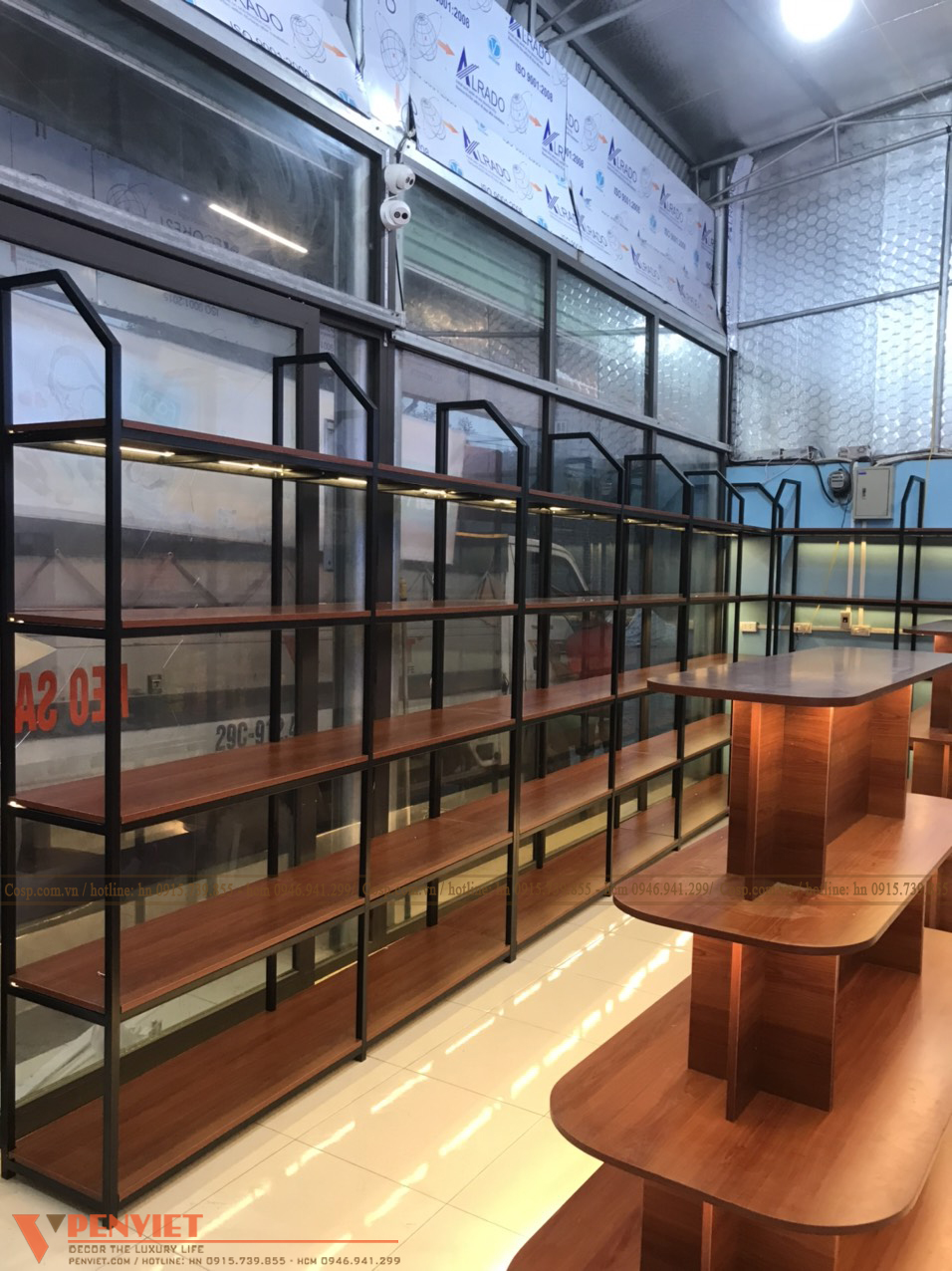 Đảo bán hàng giữa nhà sử dụng kệ được làm từ gỗ MDF phủ melamine kết hợp với sắt hộp hoặc consol tránh võng, và có đèn led hắt sáng giúp cho sản phẩm trưng bày thêm nổi bật.