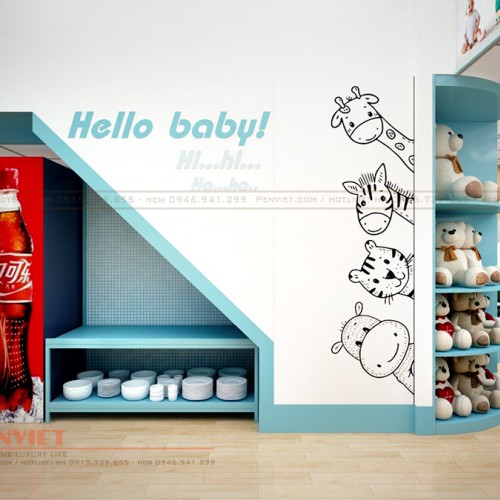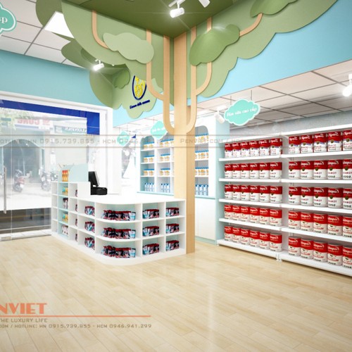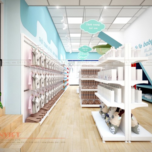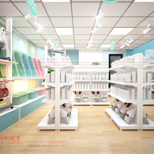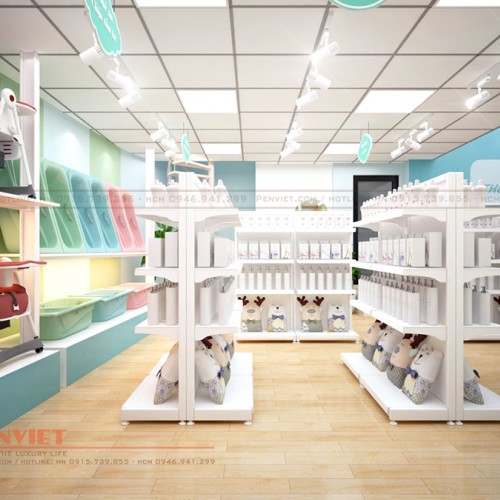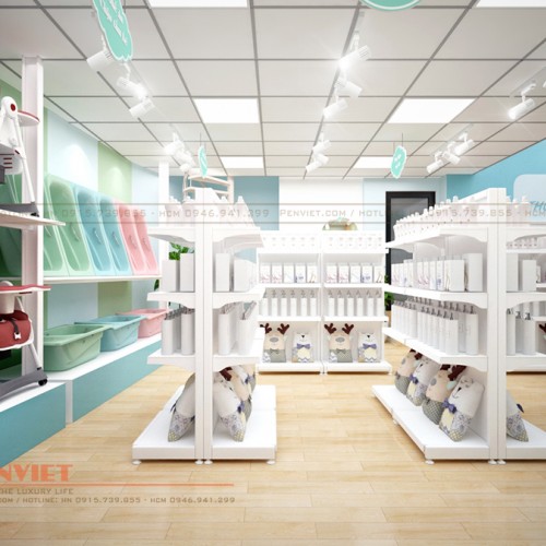 Tùy thuộc vào đặc điểm không gian và mục đích sử dụng, Penviet có sự kết hợp lựa chọn kiểu dáng tủ kệ và vật liệu linh hoạt, tạo sự ưu việt cho thiết kế shop mẹ và bé.