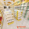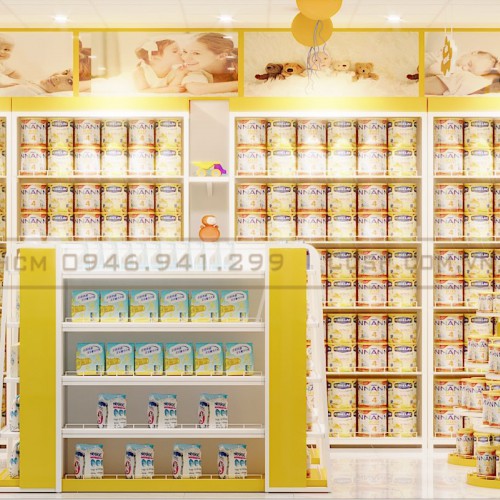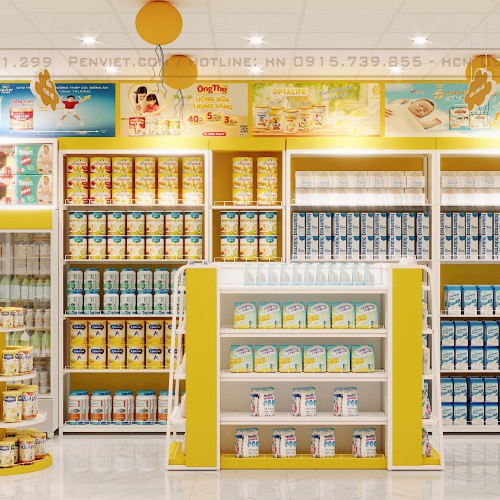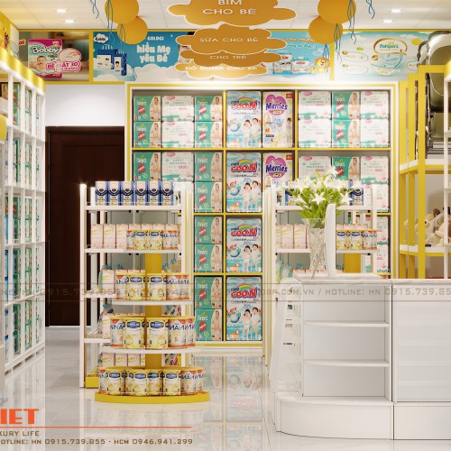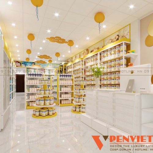 PenViet bố trí các kệ trưng bày được tạo nên từ gỗ MDF chống ẩm phủ Melamine kết hợp sơn màu độc đáo, khung sắt sơn tĩnh điện hay các kệ bỉm, kệ trên tủ mát bằng gỗ MDF chống ẩm phủ Melamine sát tường nhằm tối ưu không gian. Không những thế, việc sử dụng các kệ cao này cũng giúp bày bán được nhiều sản phẩm, góp phần mở rộng khu vực bày bán sản phẩm cho mẫu thiết kế nội thất shop mẹ và bé này.