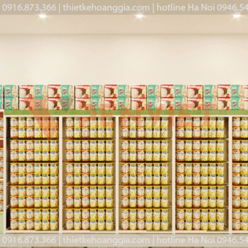 Giữa nhà là các kệ bỉm sữa hậu lưới khung sắt sơn tĩnh điện có 6 mâm tôm dày 0.65mm và 8 tay pass. Các kệ đặt ở giữa tạo ra các lối đi lại trong cửa hàng. Đồng thời chúng tôi kết hợp để các kệ đảo đồ chơi giữa nhà. Gỗ MDF dày, kính cường lực cùng trục sắt giữa nhà.