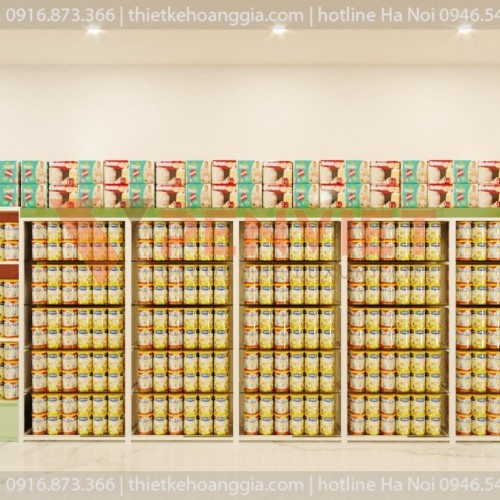 Tiếp theo xin nói đến các kệ sát tường. Không ngạc nhiên gì nữa khi hầu hết các mẫu thiết kế shop mẹ và bé đang chuộng loại kệ trưng batf sát tường như này. Những kệ sữa, kệ thời trang... làm từ gỗ MDF dày 17mm sơn 2k màu đẹp mắt xếp sát tường ngay ngắn với nhau tạo thành hệ thống dài gọn gàng.