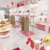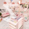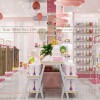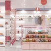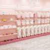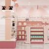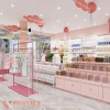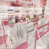 Lên đến không gian tầng 2 vẫn là những món đồ nội thất màu hồng để mang đến sự đồng nhất cho thiết kế cửa hàng. Vẫn là các hệ tủ trưng bày sát tường bằng gỗ MDF chống ẩm phun sơn 2K với hậu gỗ 6mm giúp tối ưu không gian trưng bày ở giữa tốt hơn. Tùy theo đặc tính của sản phẩm mà những chiếc kệ này sẽ được gắn các đợt gỗ hay thanh suốt inox treo sản phẩm.