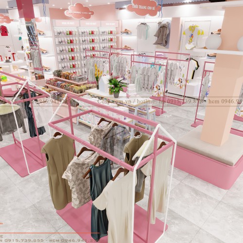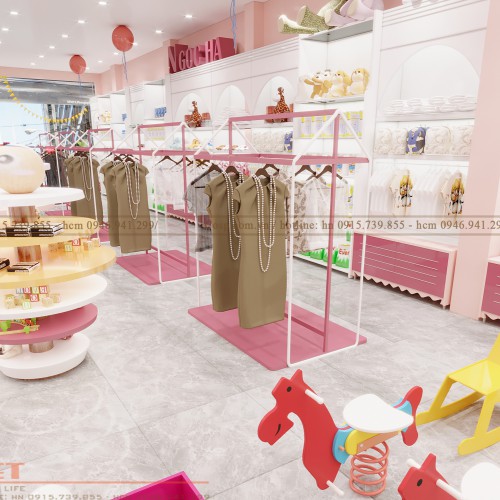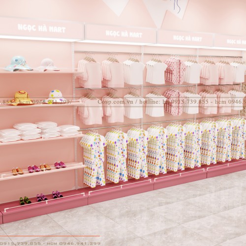 Tiếp nhận yêu cầu thiết kế biển bảng ngoài mặt tiền cùng hệ nội thất shop thời trang trẻ em ở bên trong, KTS Cosp đã lựa chọn sắc hồng và trắng để thiết kế shop mẹ bé Ngọc Hà này. Đây là gam màu rất được lòng các bé nữ, gợi cảm giác kẹo ngọt, dễ thương, rất thích hợp để sử dụng thiết kế shop mẹ bé này.