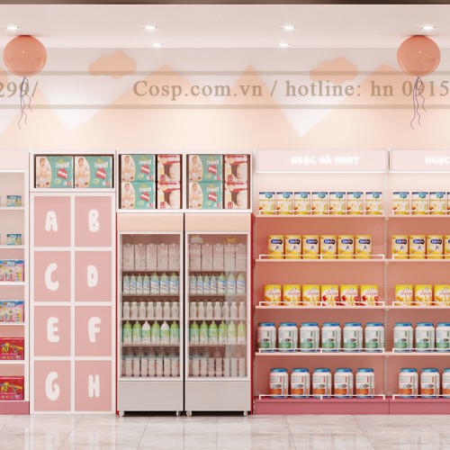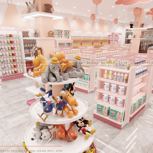 Tuy diện tích cửa hàng là khá lớn nhưng số lượng sản phẩm kinh doanh cũng rất nhiều nên cần sử dụng lượng quầy kệ trưng bày nhiều. Do đó, đòi hỏi phải bố trí không gian thật khoa học để tạo tính chuyên nghiệp tốt cho cửa hàng mẹ bé Ngọc Hà.