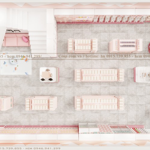 Vì sản phẩm kinh doanh nhắm đến đối tượng là các bé nhỏ cùng các mẹ nên chị Vinh yêu cầu về một không gian trưng bày thể hiện được sự dễ thương, đáng yêu. Kiến trúc sư của Cosp sau quá trình nghiên cứu mặt bằng thực tế cuối cùng đã đưa ra được mẫu thiết kế cửa hàng mẹ bé Ngọc Hà. Cùng chúng tôi tham quan một vòng shop mẹ bé Ngọc Hà thông qua những hình ảnh 3D dưới đây nhé.