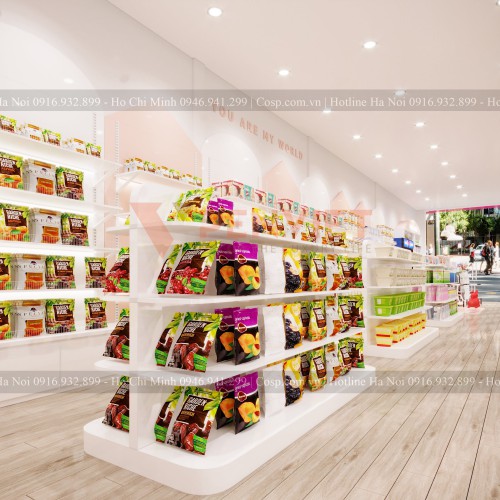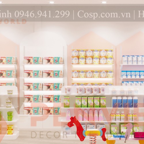 Nội thất bên trong dự án thiết kế cửa hàng mẹ và bé không cần quá cầu kỳ nhưng phải có độ bền cao và phù hợp với các sản phẩm sữa, bỉm, thực phẩm chức năng và quần áo, đồ chơi,... của các bé. Vì vậy PENVIET đã lựa chọn những kệ trưng bày có thể chịu được sức nặng và thật phù hợp với những mặt hàng này. Bên cạnh đó, những giá kệ đều sở hữu thiết kế nhiều tầng nên có thể trưng bày được nhiều đồ. Có thể nói, hầu hết mọi khoảng trống trong không gian cửa hàng đều được tận dụng triệt để tối ưu công năng sử dụng.