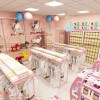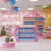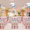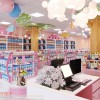 Còn phía cuối là khu vực trưng bày đồ chơi, đồ dụng học tập và quần áo. Sử dụng các kệ treo quần áo như những mẫu thiết kế shop quần áo khác thì khu vực khá lôi cuốn các bạn trẻ. Khu vực có trang trí bởi bóng bay trên trần và những miếng thả trần phân khu vực màu xanh bằng Fomex dán tranh PP.