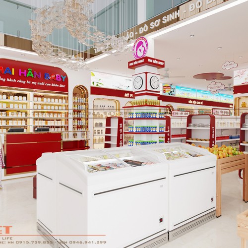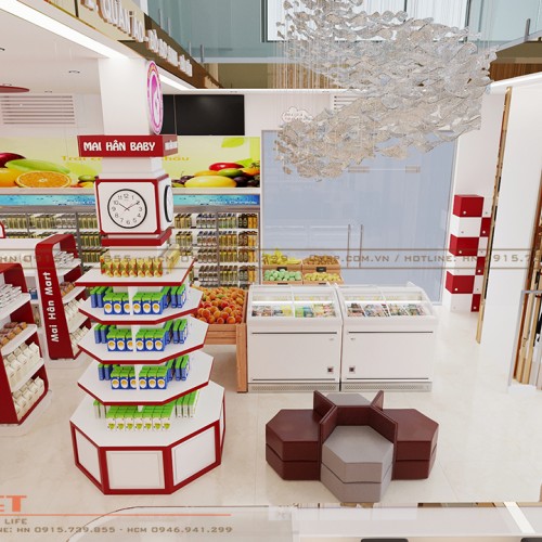 Tổng thể không gian siêu thị mẹ và bé Mai Hân Baby được phân bố trong 2 tầng phục vụ quý khách. Tại tầng 1 sẽ là siêu thị mini với đầy đủ các mặt hàng như trái cây, bánh kẹo… Tầng 2 trưng bày các mặt hàng dành cho mẹ và bé như quần áo, xe đẩy…