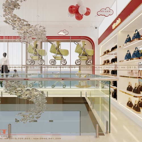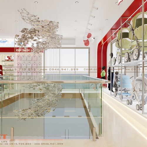 Khu vực tầng 2 của thiết kế nội thất shop mẹ và bé Mai Hân Baby là nơi trưng bày các sản phẩm như quần áo, xe đẩy… Điểm nhấn của không gian tầng 2 là hệ thống đèn chùm trang trí có kích thước lớn, kiểu dáng ấn tượng.