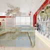 Ngoài ra, để tiết kiệm diện tích, tăng không gian trưng bày thì chủ đầu tư còn chọn các mẫu giá kệ sát tường. Để tăng thêm phần lung linh cho sản phẩm, giá kệ sát tường có thiết kế hệ thống đèn LED cho từng ô nhỏ. Ánh đèn LED vàng ấm kết hợp đèn trần sáng trắng tạo hiệu ứng ánh sáng đẹp mắt cho không gian trưng bày.