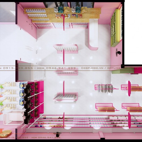 Từ trên cao nhìn xuống, toàn bộ đồ nội thất trong cửa hàng được bố trí rất hợp lý và khoa học. Từng khu vực bán hàng được phân chia hài hòa, lối đi có diện tích rộng rãi giúp khách hàng và nhân viên thoải mái di chuyển khi chọn lựa hay tư vấn sản phẩm. Dưới bàn tay của các Kiến trúc sư PenViet thì shop mẹ và bé vừa được trang trí gọn gàng, vừa có thể tận dụng không gian tăng tối đa diện tích trưng bày, vừa tạo sự thoải mái cho người tiêu dùng khi mua sắm.