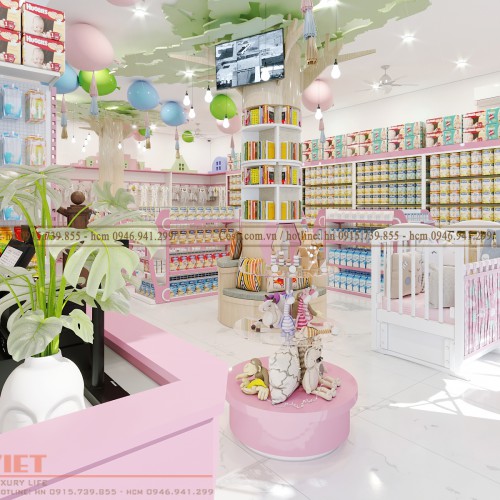 Thiết kế siêu thị sử dụng tông màu như hồng phấn, trắng ghi,… dễ thương phù hợp với các bé. Bên cạnh đó, thiết kế nội thất siêu thị bé yêu tinh tế, phối màu khéo léo ăn nhập với không gian mang tới sự chuyên nghiệp cho siêu thị…v.v.