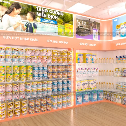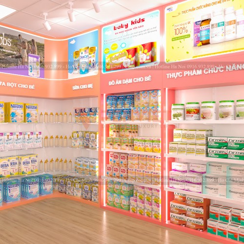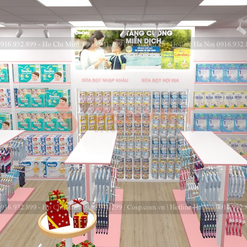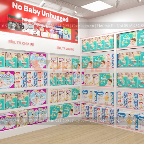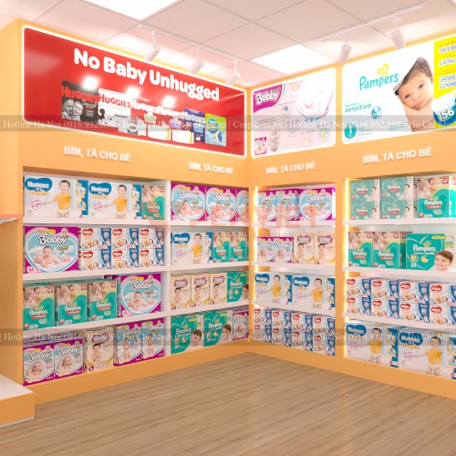 Mỗi tủ sát tường được bày bán chuyên biệt một loại sản phẩm từ kệ bỉm tã, kệ sữa, kệ đồ ăn dặm cho bé, kệ thực phẩm chức năng. Phía trên các trán tủ đều được gắn bộ chữ chân fomex mặt mica không phát sáng. Mỗi tủ sẽ đều được gắn các bộ chữ riêng để phân biệt khu vực bày bán tốt hơn.