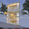 Thiết kế shop trẻ em với hai bên cửa là hai tấm biển phụ với hệ thống đèn led chiếu sáng cùng những hình ảnh quảng cáo sản phẩm vô cùng đáng yêu. Phía bên trên là tấm biển hiệu chính được KTS kết hợp màu trắng và vàng rất khoa học, làm nổi bật lên tên của shop và đồng thời tạo nên điểm nhấn trong mắt khách hàng.