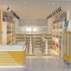 Màu sơn vàng và trắng được phối hài hòa, vừa tạo nên sự tương phản nổi bật vừa mang lại cảm giác nhẹ nhàng, tươi tắn và sinh động cho nội thất chung. Ngoài ra ở giữa gian còn có 4 chiếc kệ trưng bày hai mặt. Những chiếc kệ này có kích thước nhỏ hơn nhưng lại rất có “võ” khi mang lại hiệu quả cao.
