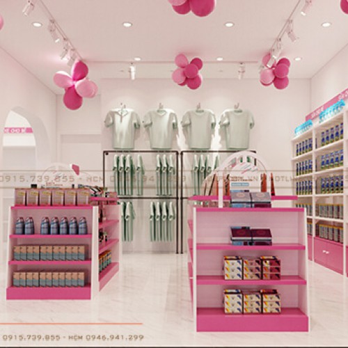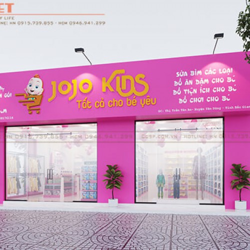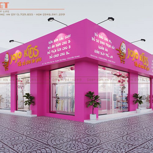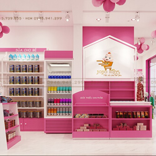 Phong cách hiện đại được chúng tôi tư vấn cho chủ đầu tư để thiết kế shop mẹ và bé JoJo Kids. Penviet sử dụng màu hồng làm điểm nhấn cho không gian, vừa giúp mang đến sự nổi bật cần có, vừa mang đến một không gian ngọt ngào, dễ thương. Sự kết hợp giữa gam màu này với sắc trắng chủ đạo tạo nên hình ảnh cửa tiệm hiện đại, thu hút khách hàng.