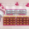 Ở vị trí trung tâm, chúng tôi sắp xếp các kệ đồ chơi, kệ đồ tiện ích cho bé bằng gỗ MDF chống ẩm phủ Melamine và khung sắt hộp sơn tĩnh điện. Đây là các mặt hàng phổ biến, được nhiều người quan tâm. Bởi vậy, ý đồ của sự bố trí này là giúp các sản phẩm này được highlight, từ đó thúc đẩy doanh số cho cửa tiệm.