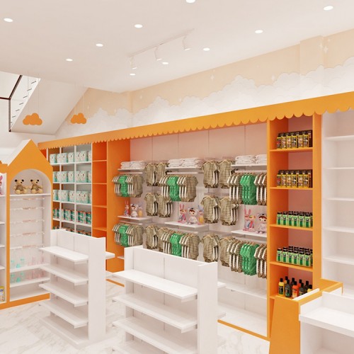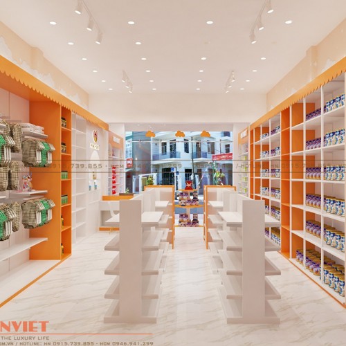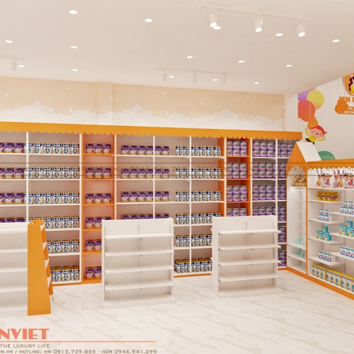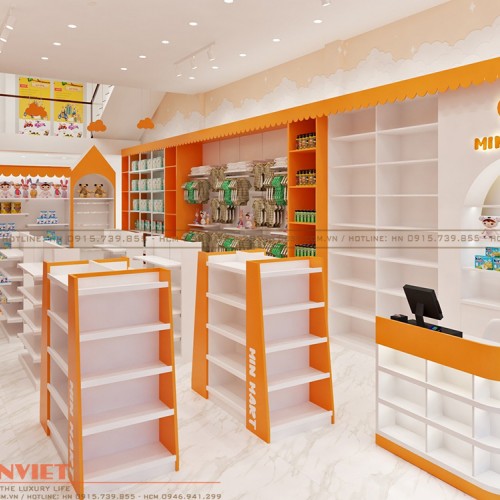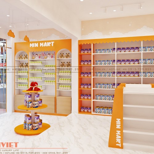 Thiết kế nội thất shop mẹ và bé Minmart được phân chia khu vực chức năng khoa học, bố trí nội thất hợp lý để có thể trưng bày nhiều sản phẩm nhất. Ngoài ra vẫn đảm bảo không gian thoáng đãng, đẹp mắt để tạo ấn tượng tốt nhất cho khách hàng.