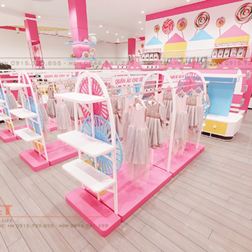 Khu vực trưng bày các sản phẩm thời trang trong thiết kế shop mẹ và bé được bố trí với các kệ đặc trưng, phù hợp. Được làm từ khung sắt sơn tĩnh điện kết hợp các đợt gỗ MDF chống ẩm phủ sơn PU, các kệ này có màu sắc bắt mắt và làm tôn lên vẻ đẹp của các sản phẩm thời trang rất hiệu quả. Với thiết kế vòng cung, các kệ này giúp không gian trở nên mềm mại và có tính thẩm mỹ hơn. Điều này cũng giúp hạn chế thương tích nếu không may khách hàng va phải trong quá trình mua sắm, nhờ đó thể hiện sự chuyên nghiệp và tinh tế của chủ đầu tư.