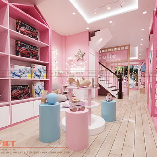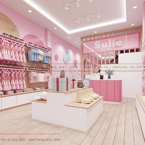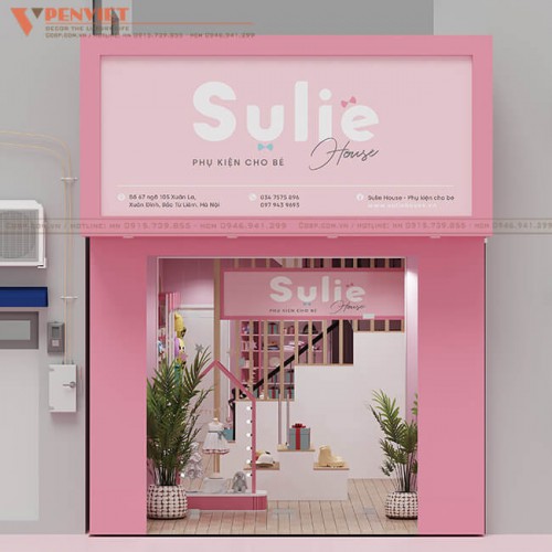 Thông qua khảo sát hiện trạng mặt bằng kết hợp với việc lắng nghe nhu cầu của khách hàng, các kiến trúc sư của Penviet tư vấn cho chủ đầu tư setup không gian theo phong cách hiện đại, sử dụng màu hồng làm gam màu chủ đạo để mang đến một thế giới trẻ thơ ngọt ngào, bay bổng. Chúng tôi cũng chú trọng vào việc bố trí mặt bằng nội thất khoa học để tối ưu diện tích cửa tiệm. Điều này vừa đáp ứng được yêu cầu của chị Ngân về công năng, tính thẩm mỹ mà còn phù hợp với sở thích của nhóm đối tượng khách hàng đặc biệt mà shop phụ kiện này hướng đến, tạo nên sự thu hút cho mẫu thiết kế shop mẹ và bé Sulie.