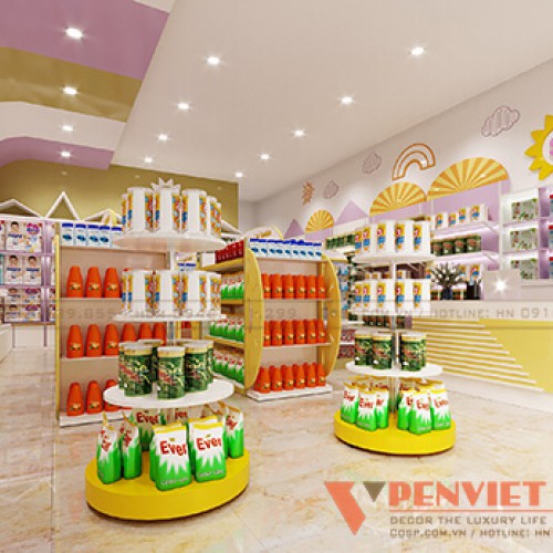 Thực tế cho thấy, dù với diện tích chỉ khoảng 50m2, song, tình trạng mặt bằng còn khá mới, do đó, các kiến trúc sư của chúng tôi tư vấn cho khách hàng tận dụng triệt để các hạng mục có sẵn như trần, tường, sàn, hệ thống ánh sáng nhằm tiết kiệm tối đa chi phí đầu tư. Tuy nhiên, để làm nên diện mạo khác biệt và nổi bật cho shop mẹ và bé, Penviet cũng cần thực hiện đồng bộ các giải pháp thiết kế, sử dụng những ý tưởng setup sáng tạo, độc đáo để tạo dựng hình ảnh ấn tượng cho cửa hàng.