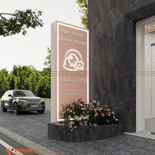 Mẫu thiết kế shop mẹ và bé Baby home được setup hệ biển Alu nền màu hồng cam làm nổi bật bộ chữ bằng Mica trong chân Fomex. Viền của hệ biển được thiết kế với hệ đèn Led chạy viền cũng làm tôn lên bộ logo bằng Mica trắng in UV phát sáng mặt.
