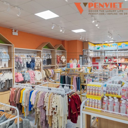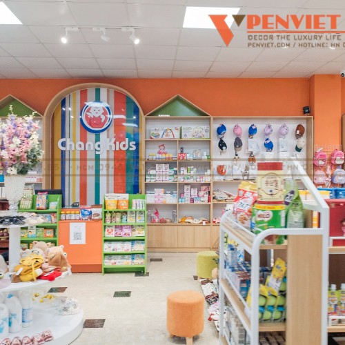 Nhằm phát huy những lợi thế về mặt bằng, trong mẫu thiết kế shop mẹ và bé Chang Kids, Penviet đã thực hiện setup hệ thống quầy kệ lớn áp tường với chất liệu gỗ MDF chiếm phần lớn. Tại không gian giữa cửa hàng, chúng tôi đặt các kệ khung sắt sơn tĩnh điện giúp trưng bày đa dạng các loại hàng hóa và giúp khách hàng có những trải nghiệm mua sắm tuyệt vời.