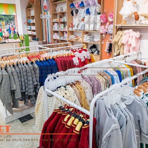 Chúng tôi bố trí các kệ treo đồ giữa không gian shop tạo lối đi thông thoáng cho khách hàng đến shop mẹ và bé Chang Kids lựa chọn đồ.