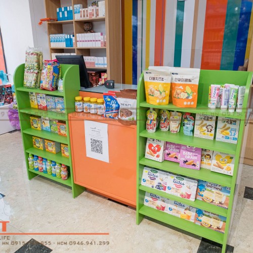 Chúng tôi cũng bố trí các kệ ăn dặm tại không gian giữa cửa hàng với thanh chắn chống rơi đồ, đảm bảo an toàn cho các sản phẩm được trưng bày.