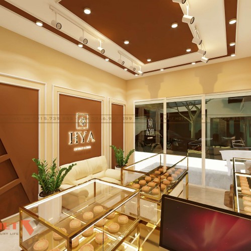Màu sắc chủ đạo của shop là màu nâu và màu kem nhạt cùng các chi tiết viền vàng mang đến sự ấm áp và quý phái. Màu nâu được sử dụng trên các mảng tường, viền tủ kính và trần nhà rất vững chãi, phù hợp với không gian phong thủy.