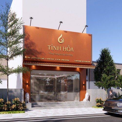 Ngay từ cái nhìn đầu tiên, biển bảng của thiết kế shop đá phong thủy Tĩnh Hỏa đã tạo nên dấu ấn khó quên. Với tông màu cam đất gạch nung đặc trưng là biểu tượng của năng lượng dương mạnh mẽ và kết nối với yếu tố Thổ trong ngũ hành.