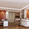 Tủ kính trung tâm: Là khu vực trưng bày các loại đá quý cao cấp, mặt dây chuyền, vòng tay... Tủ được thiết kế dạng đảo, với kính cường lực trong suốt, khung viền kim loại ánh vàng hồng. Phần tủ bên dưới được sơn trắng để tạo sự đối lập và giữ cho mắt người nhìn luôn tập trung vào sản phẩm.