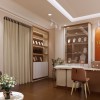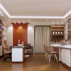 Bên cạnh đó, ghế sofa nâu đất và bàn trà tròn nhỏ được đặt sát tường để khách hàng có thể ngồi thư giãn, tư vấn phong thủy hoặc chờ đợi. Chi tiết tấm thảm tròn và chậu cây xanh được sử dụng để tăng tính mềm mại, phá vỡ sự khô cứng của các hình khối trong thiết kế nội thất.